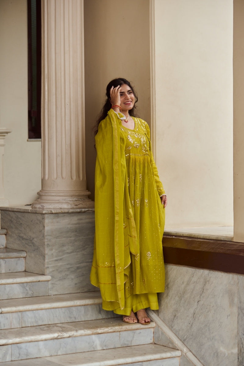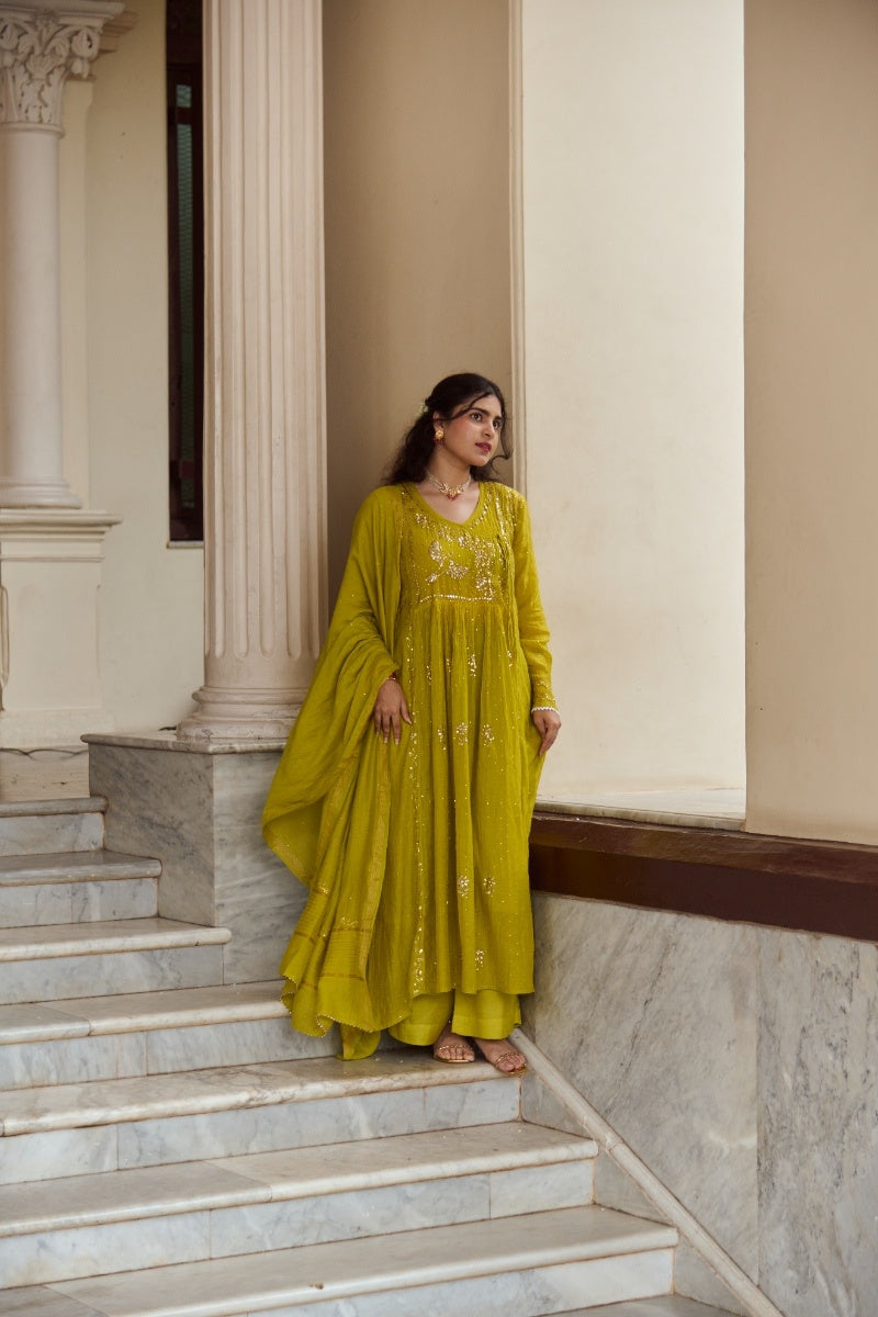 A statement angarkha silhouette in a vibrant mustard-lime tone, featuring flowing layers for graceful movement and an easy, flattering fit. Traditional mukaish dots and refined pitta embroidery add festive shimmer across the yoke and panels, creating a luminous, artisanal finish.