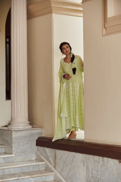 Lime Georgette Chikankari Jhaali Anarkali Set