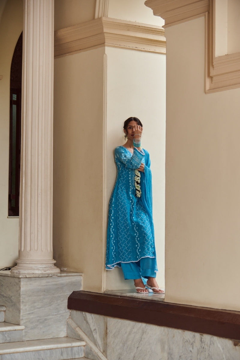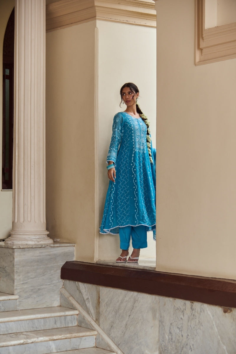 A breezy blue Anarkali crafted in soft mul chanderi, offering a gentle sheen and flowy drape for effortless movement. Intricate surface detailing blends cutdana, pearls, and sequins over chikankari-inspired patterns, creating a refined sparkle perfect for festive days and evening celebrations.