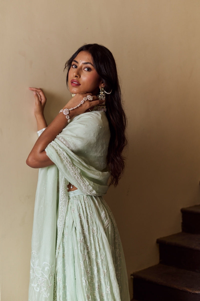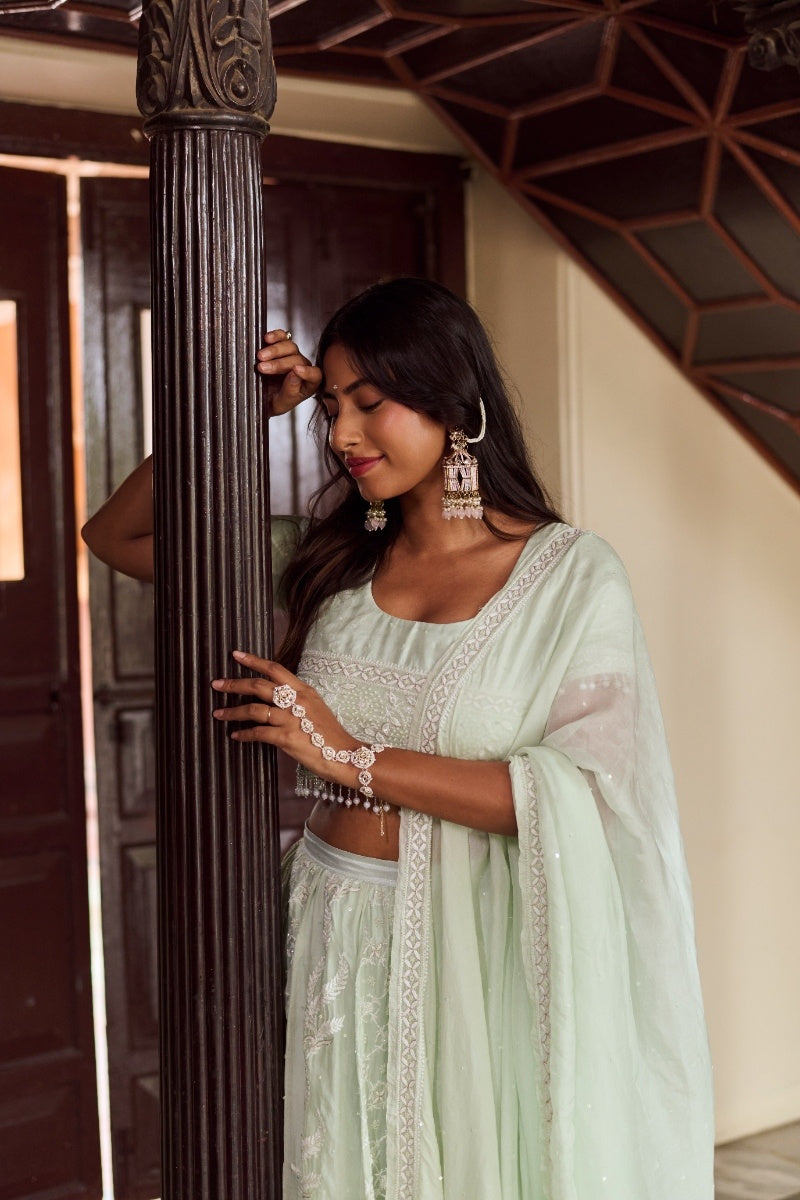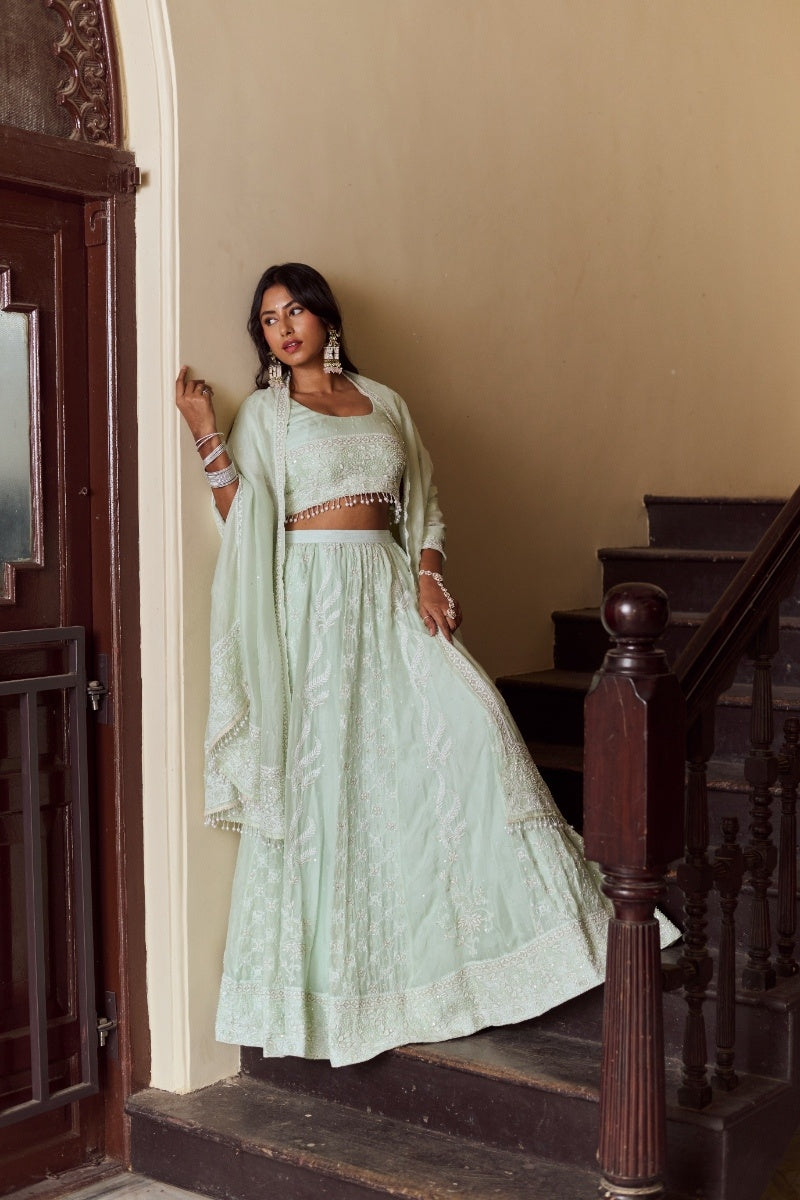 An ethereal mint lehenga set in sheer organza, crafted with delicate chikankari and finished with pearl and sequin accents for a luminous, modern-heritage look. Lightweight movement and soft shimmer make it perfect for sangeets, receptions, and evening celebrations.