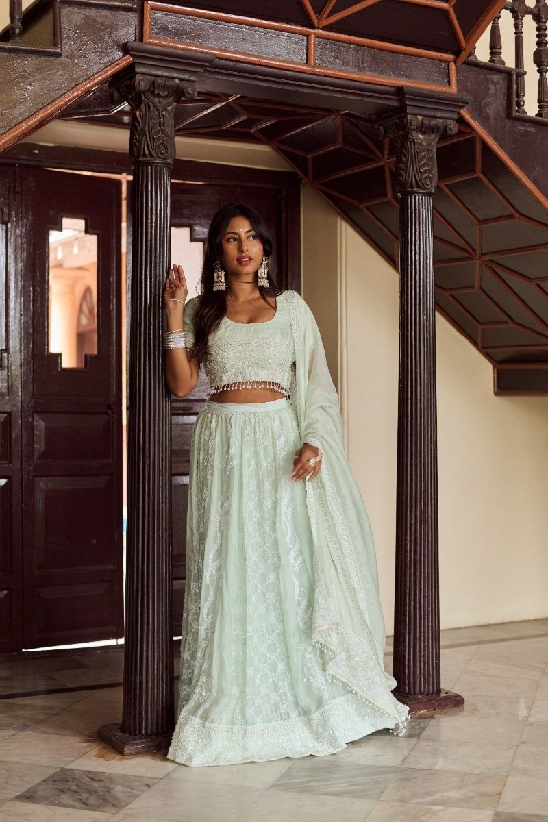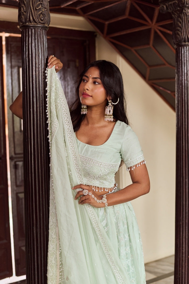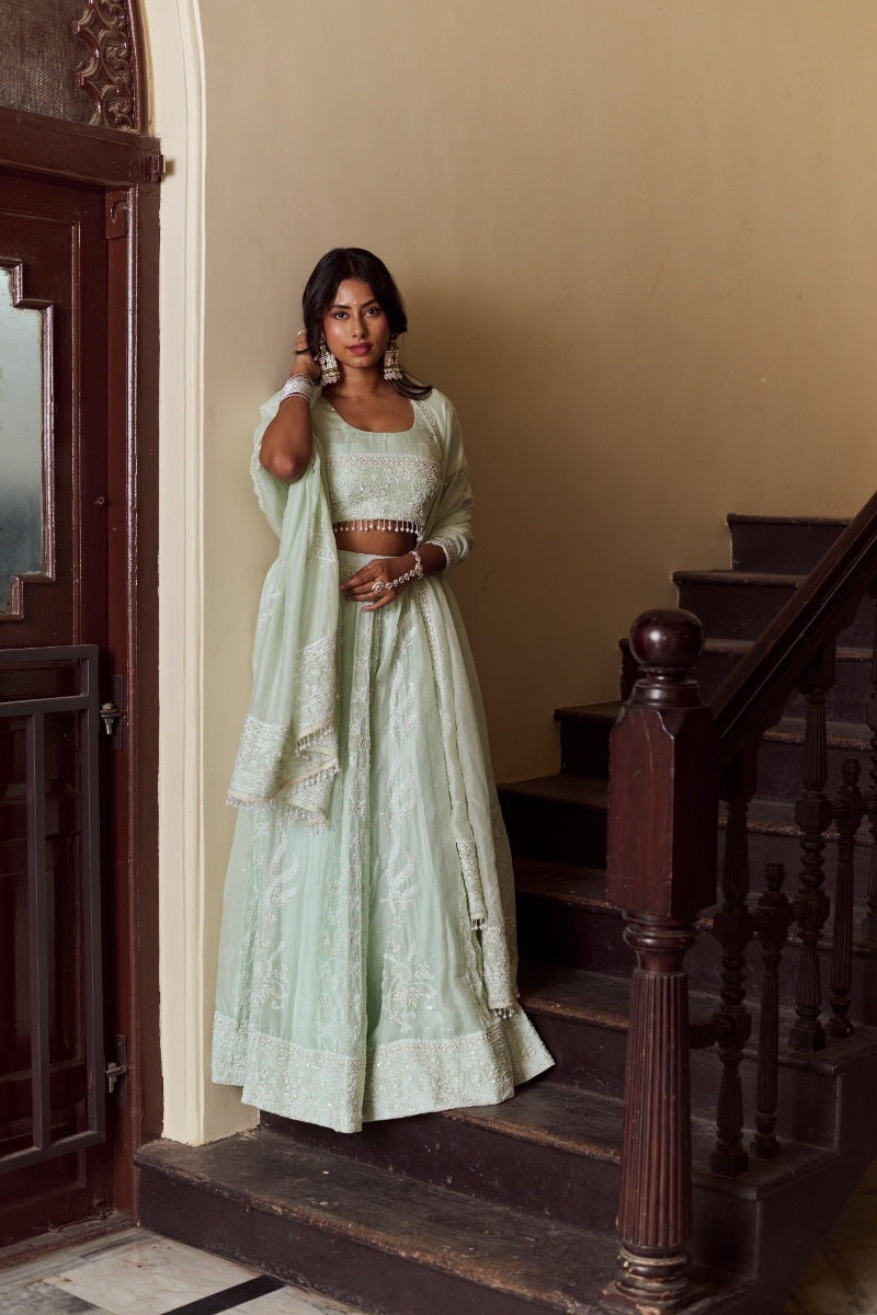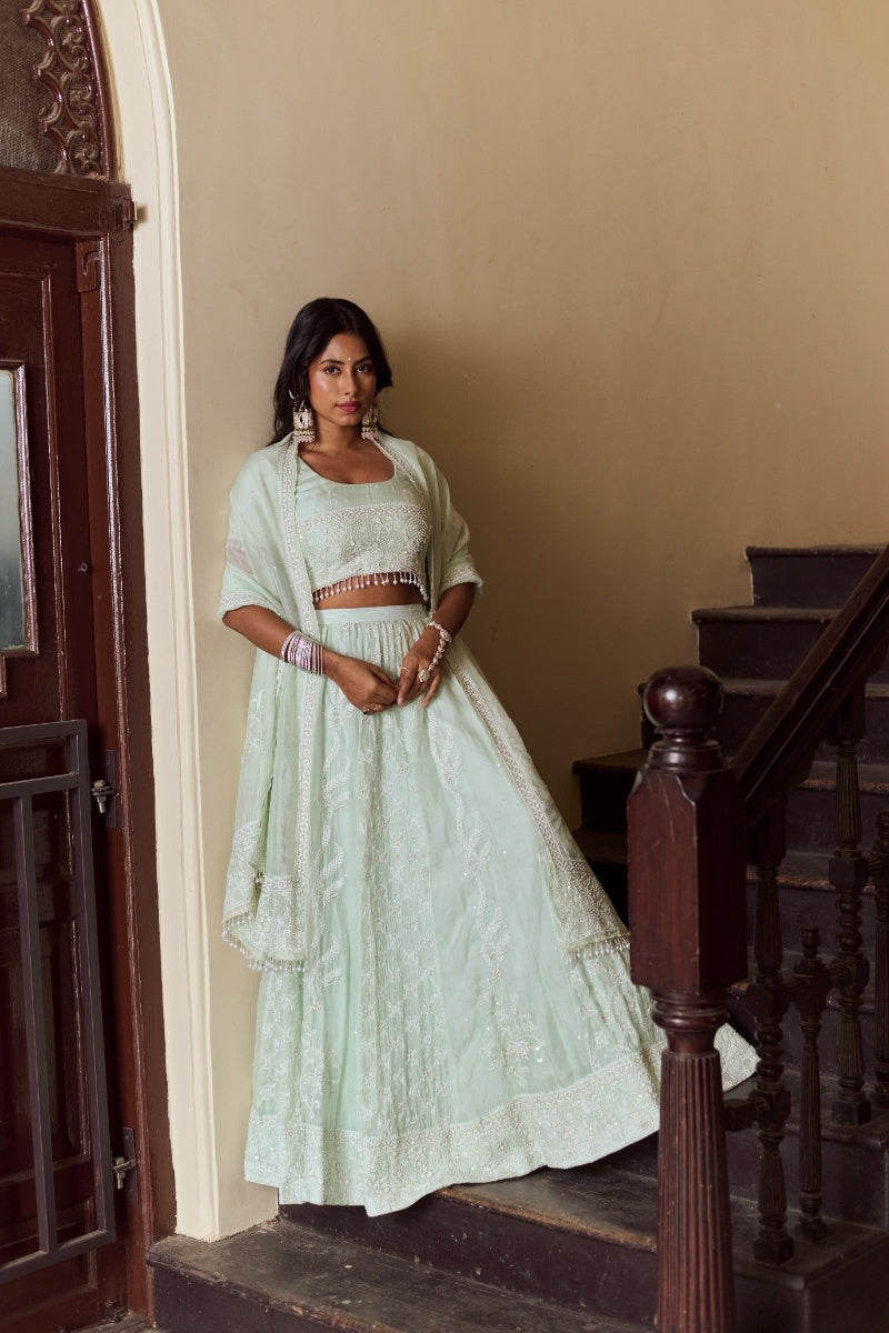 An ethereal mint lehenga set in sheer organza, crafted with delicate chikankari and finished with pearl and sequin accents for a luminous, modern-heritage look. Lightweight movement and soft shimmer make it perfect for sangeets, receptions, and evening celebrations.