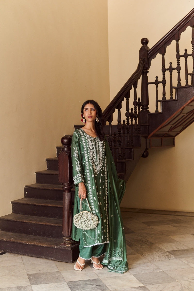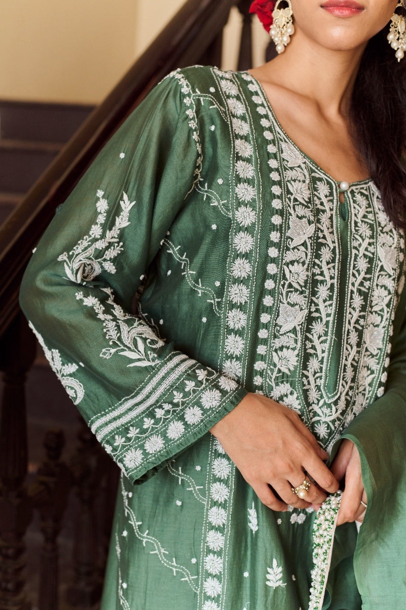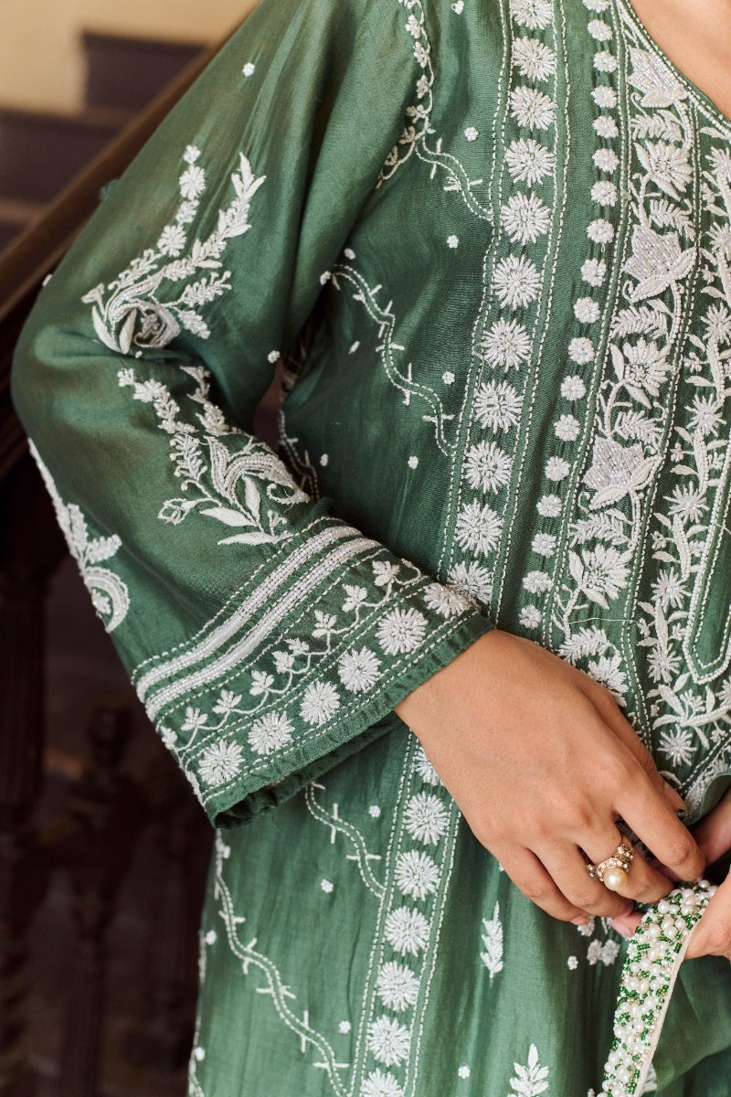 A rich green kurta set crafted in silk chanderi and mul chanderi blends, offering a luminous sheen with a soft, breathable drape. Intricate chikankari is elevated with subtle cutdana highlights, adding refined sparkle perfect for festive evenings and special occasions.