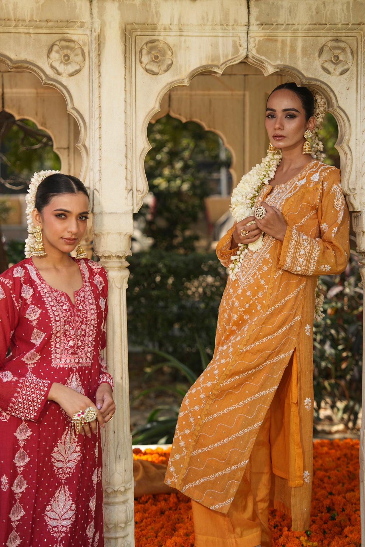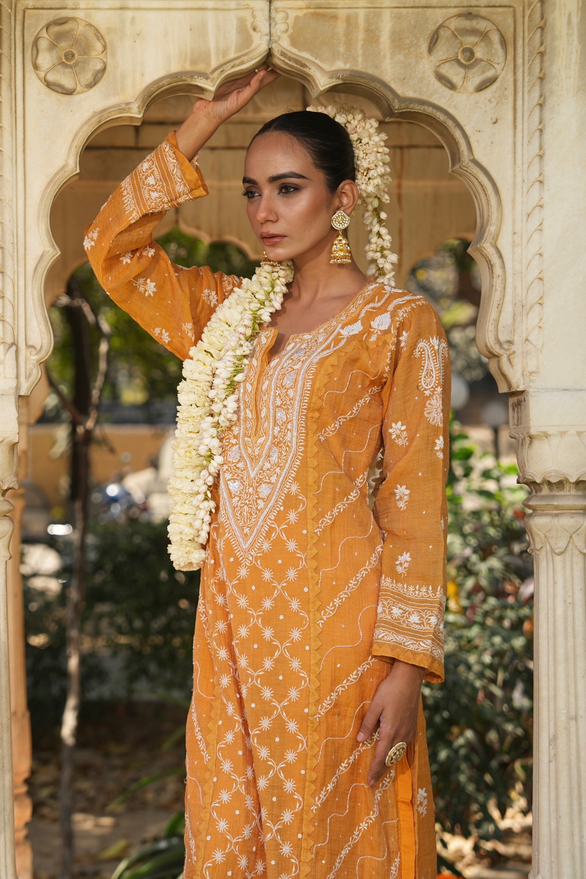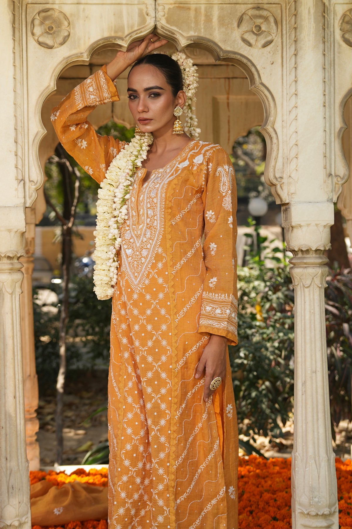 Radiate effortless elegance in our Orange Tissue Kurta Set, a stunning blend of sheer sophistication and traditional flair. Crafted in lightweight tissue fabric, the set features a lustrous finish and subtle shimmer that makes it perfect for festive occasions. Whether you're attending a day function or a celebratory dinner, this kurta set brings the perfect pop of color and style to your wardrobe.