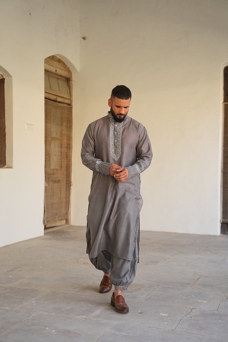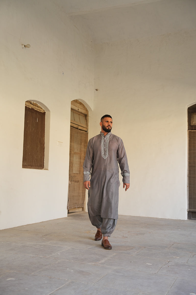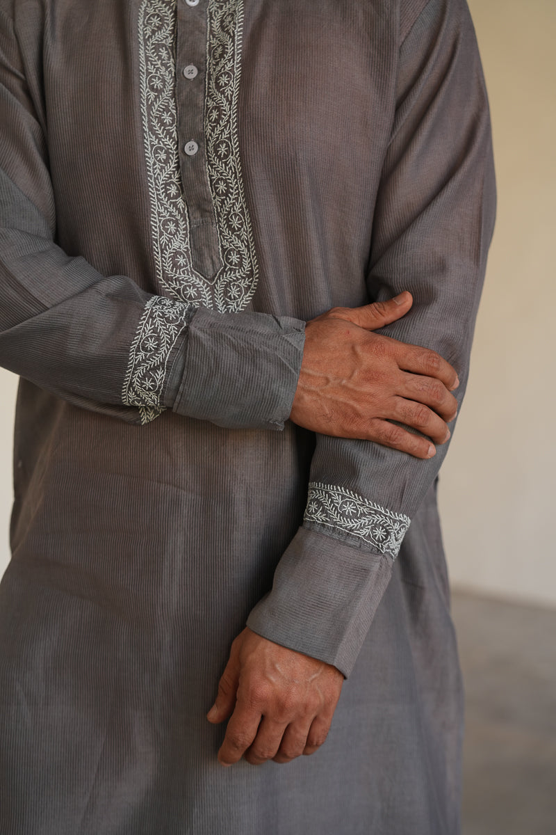 A modern classic, this grey Chikankari kurta is crafted from airy Maheshwari fabric, known for its delicate texture and subtle sheen. The tone-on-tone hand embroidery adds depth and quiet sophistication, making it perfect for evening soirees or festive days when understated elegance speaks volumes. A versatile piece that pairs tradition with contemporary charm.