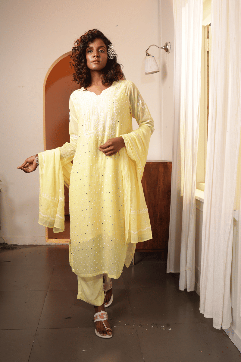 Finished with delicate cutdana, mirror accents, and classic chikankari work, it has just the right festive glow. The set includes a kurta, matching pants, and a dupatta — perfect for haldi functions, daytime celebrations, or intimate gatherings.