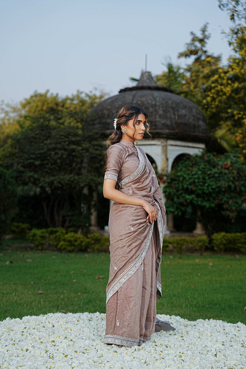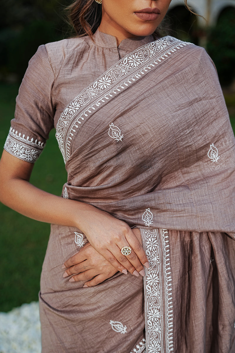 An earthy brown mul chanderi saree, hand-embroidered with fine chikankari and airy jhaali work. The touch of colour thread adds a subtle vibrance without taking away its understated charm. Ideal for low-key festive days, intimate gatherings, or when you're in the mood for something elegant yet grounded.
