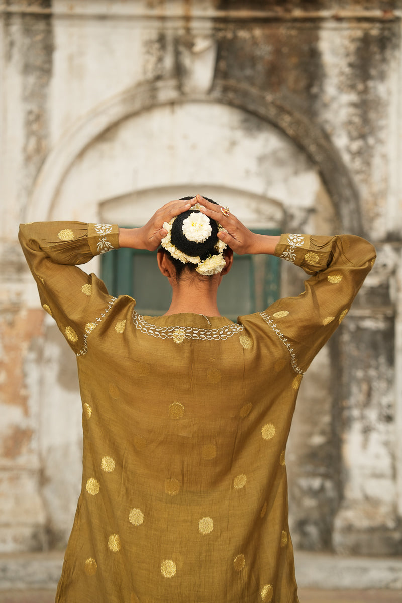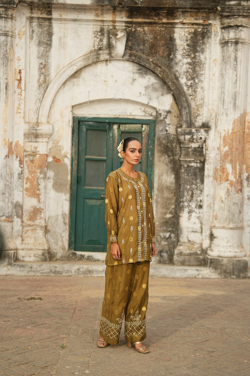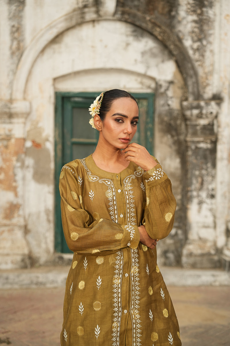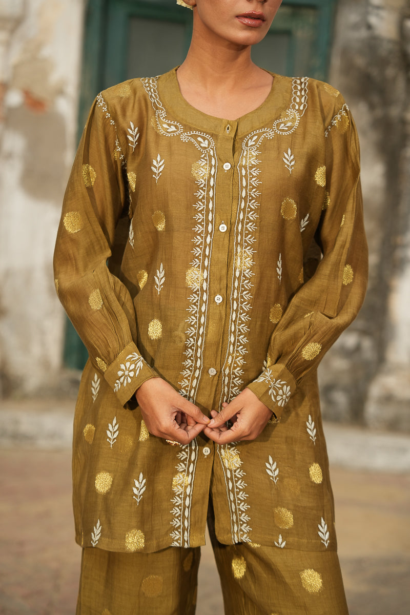 Effortlessly elegant, this green co-ord set is tailored in luxurious Banarasi Mul Chanderi and features timeless Chikankari embroidery. A modern silhouette blended with traditional charm — perfect for festive brunches, cultural events, or refined everyday dressing.