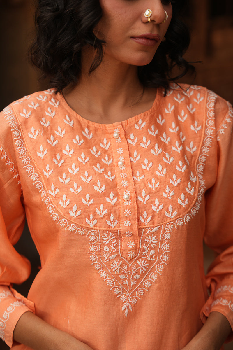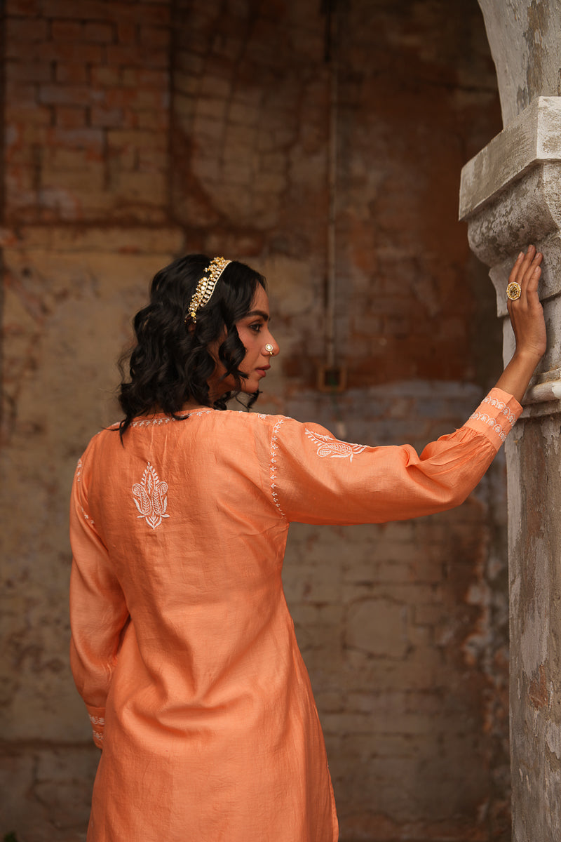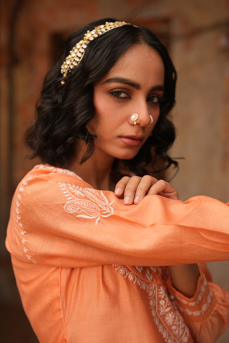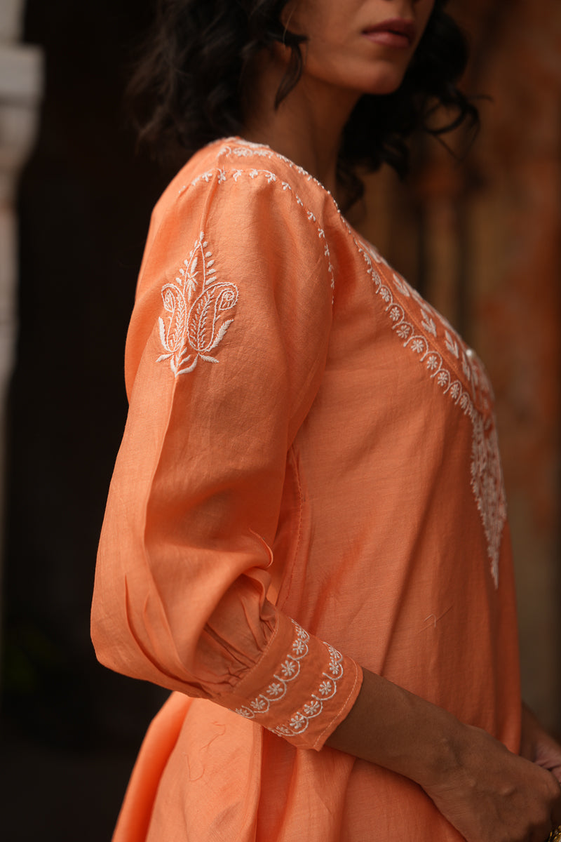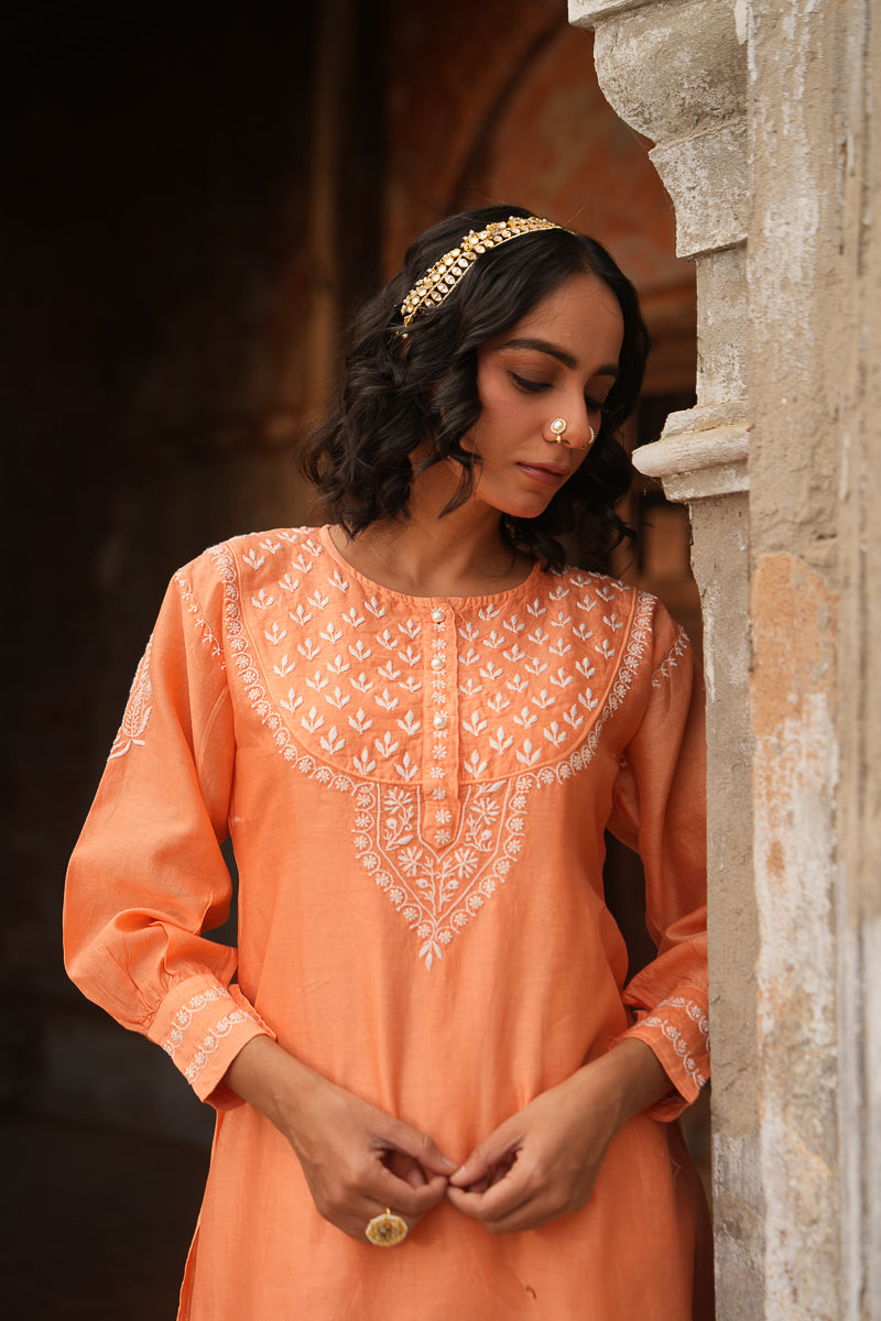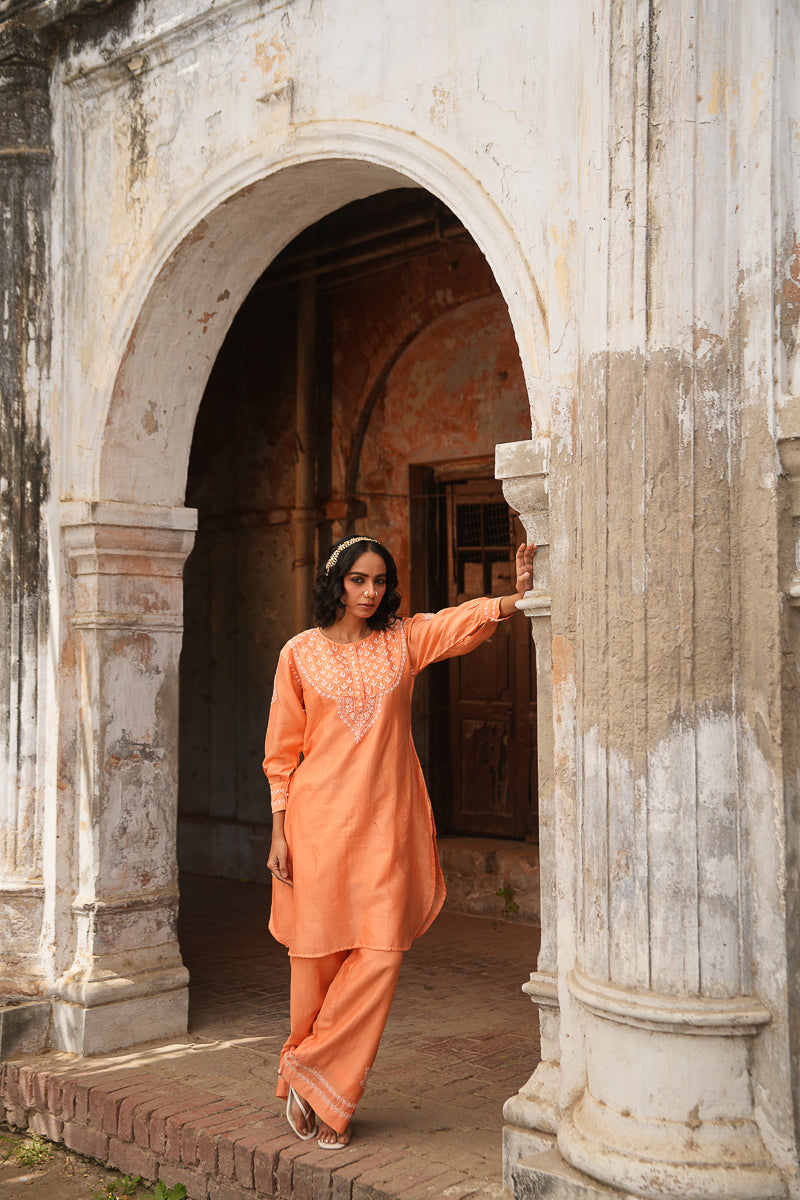 Vibrant yet graceful, this orange co-ord set in Silk Chanderi features intricate Chikankari embroidery that adds a touch of traditional charm to its contemporary silhouette. A versatile pick for festive brunches, casual gatherings, or intimate celebrations.
