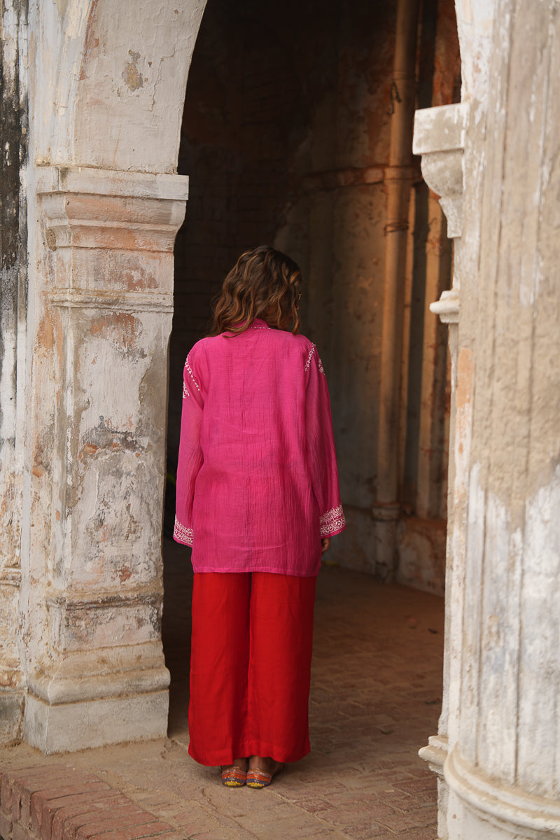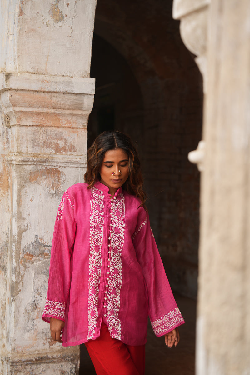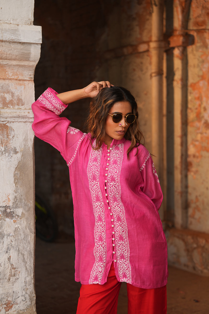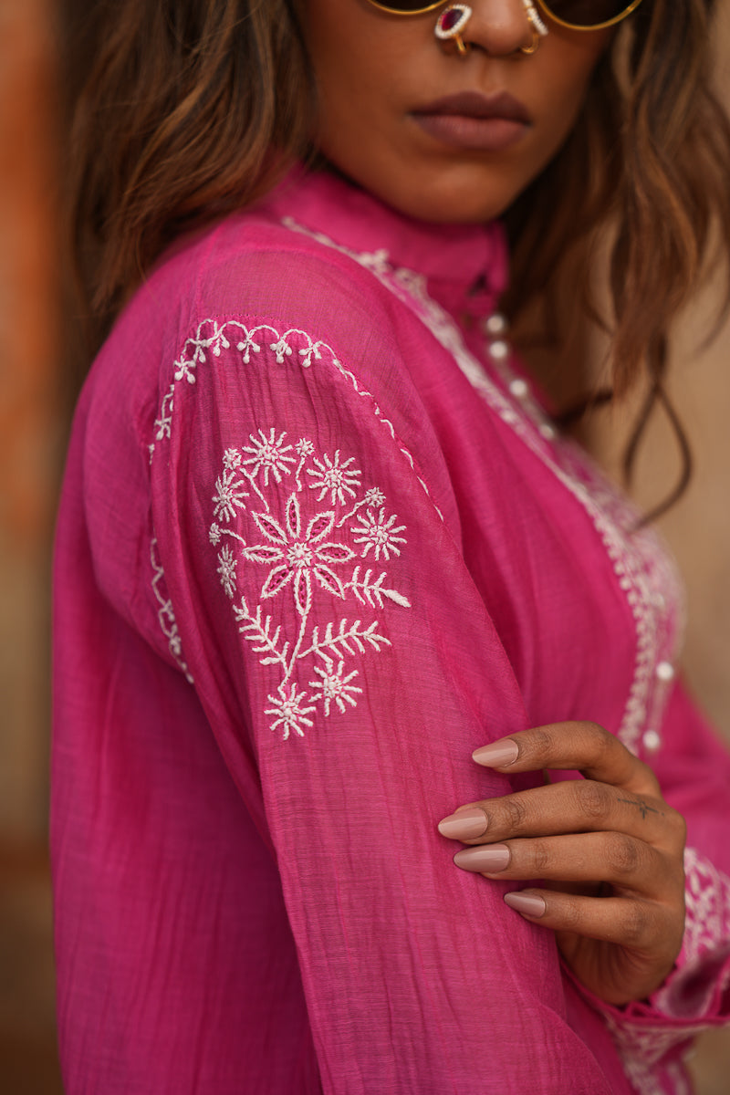 Lightweight and breezy, this Pink Co-ord Set in soft mul chanderi features fine hand-embroidered chikankari that adds a touch of elegance to its minimal silhouette. Perfect for daytime outings, festive brunches, or easy summer styling, this handcrafted set is equal parts comfort and charm.