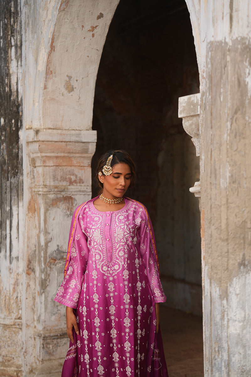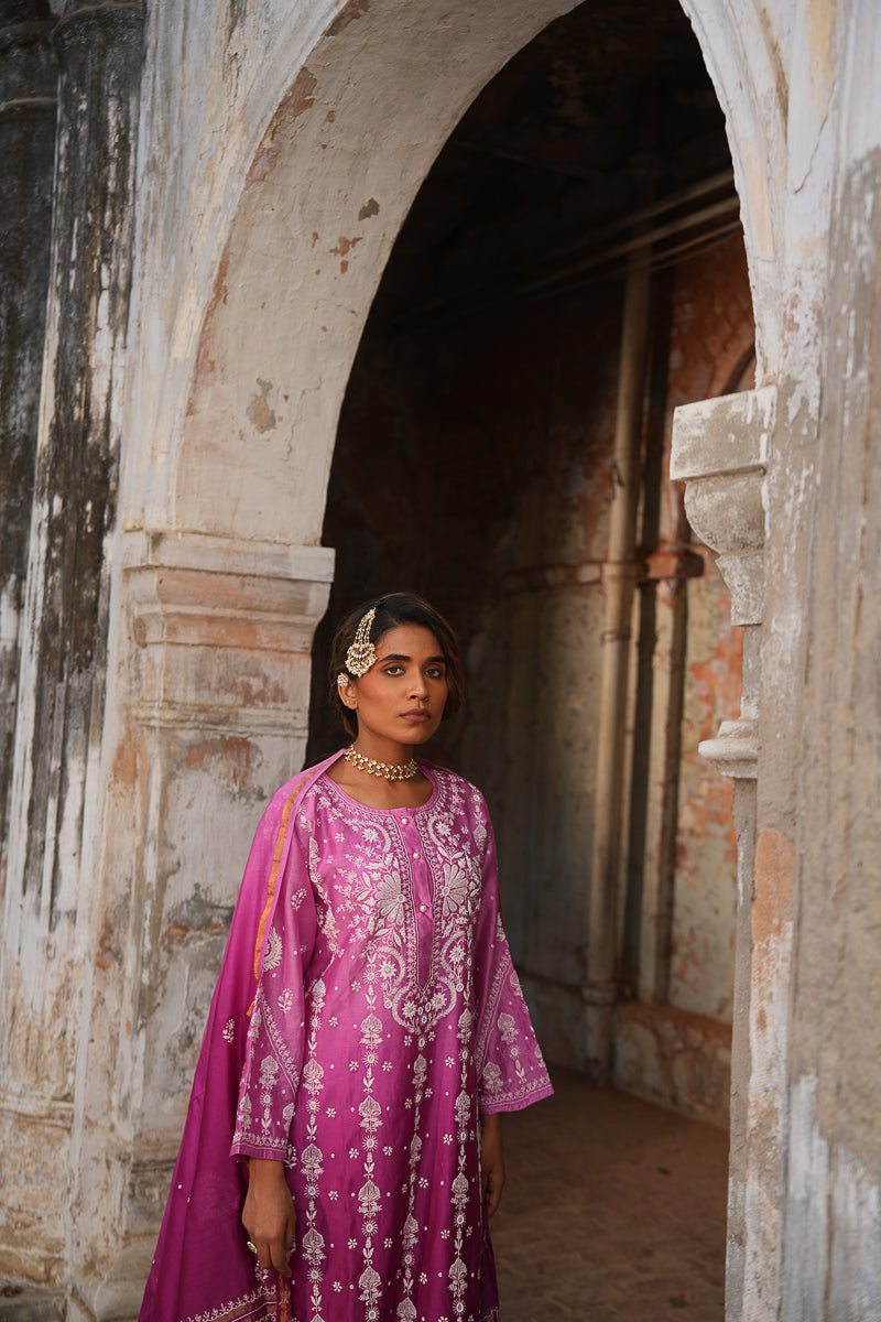 Pink Ombre Silk Chanderi Chikankari Kurta Dupatta And Pant Set