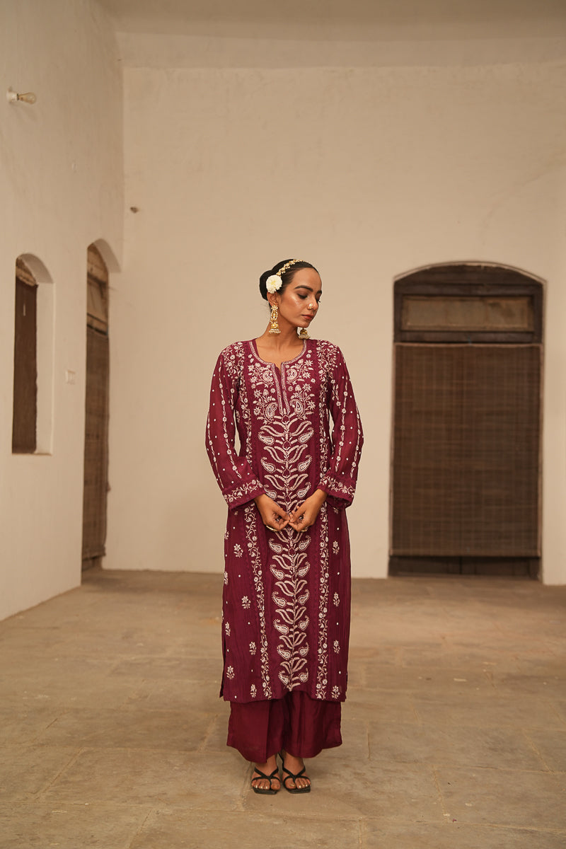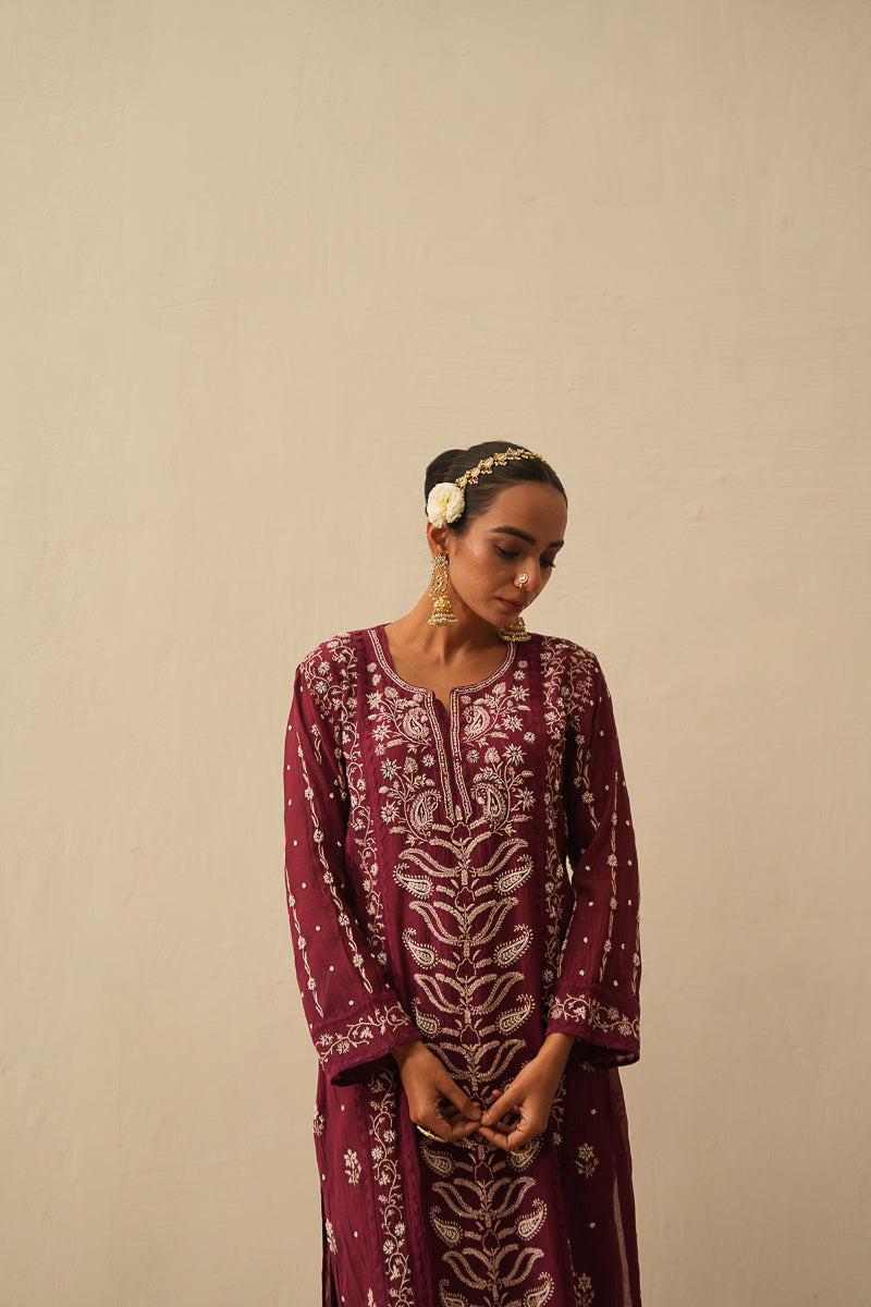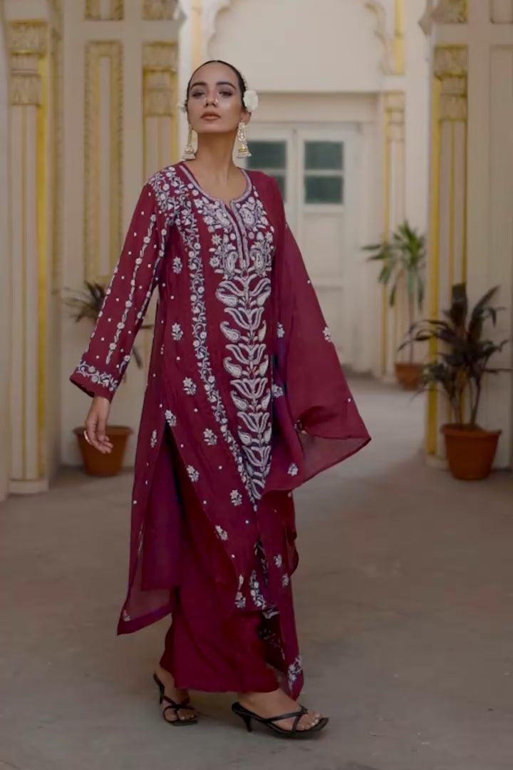 A vibrant celebration of craft, this red kurta set in airy Mul Chanderi is adorned with exquisite Chikankari, fine Jhaali detailing, and elegant appliqué work. Embellished with shimmering cutdana, sequins, and delicate pearls — this ensemble is designed to make a statement at every celebration.