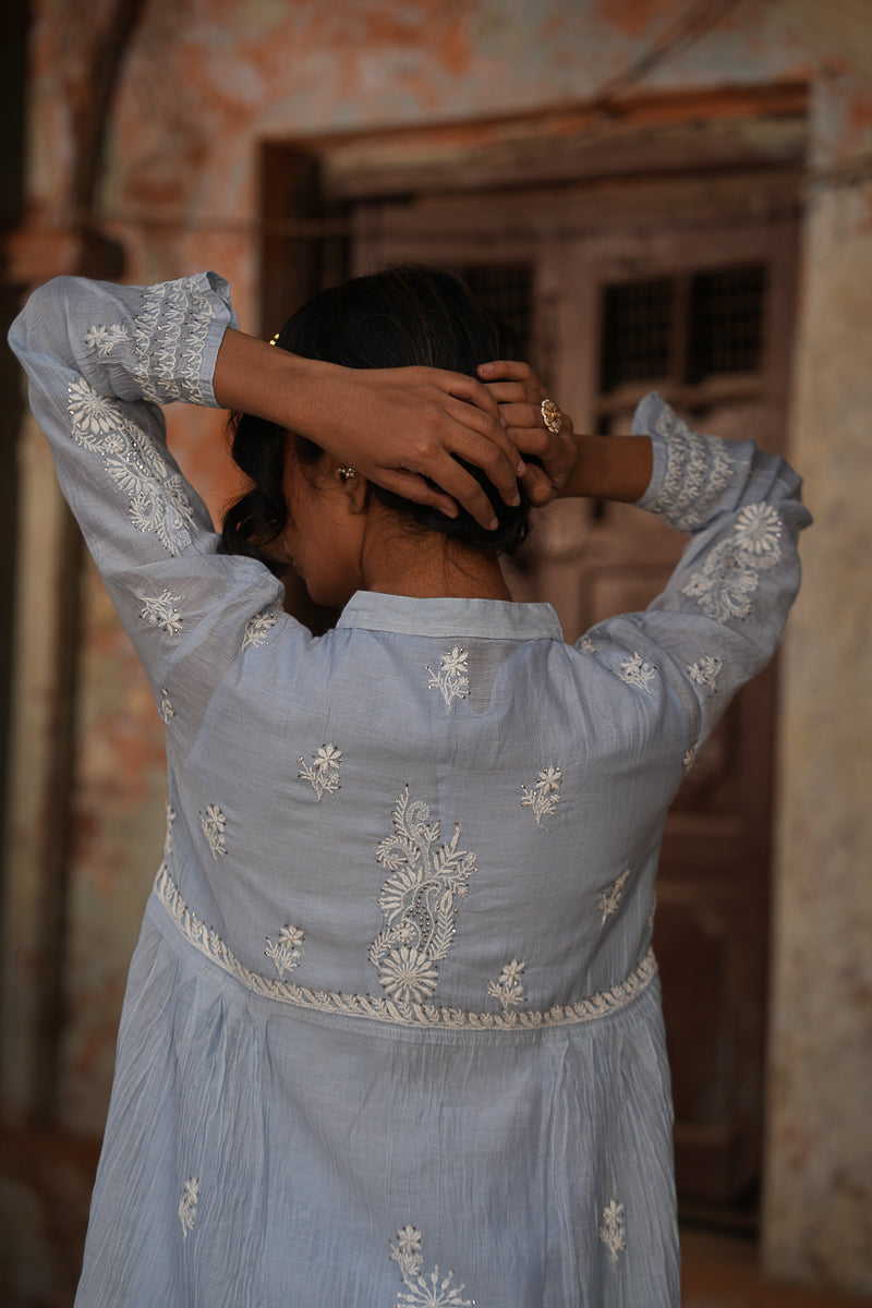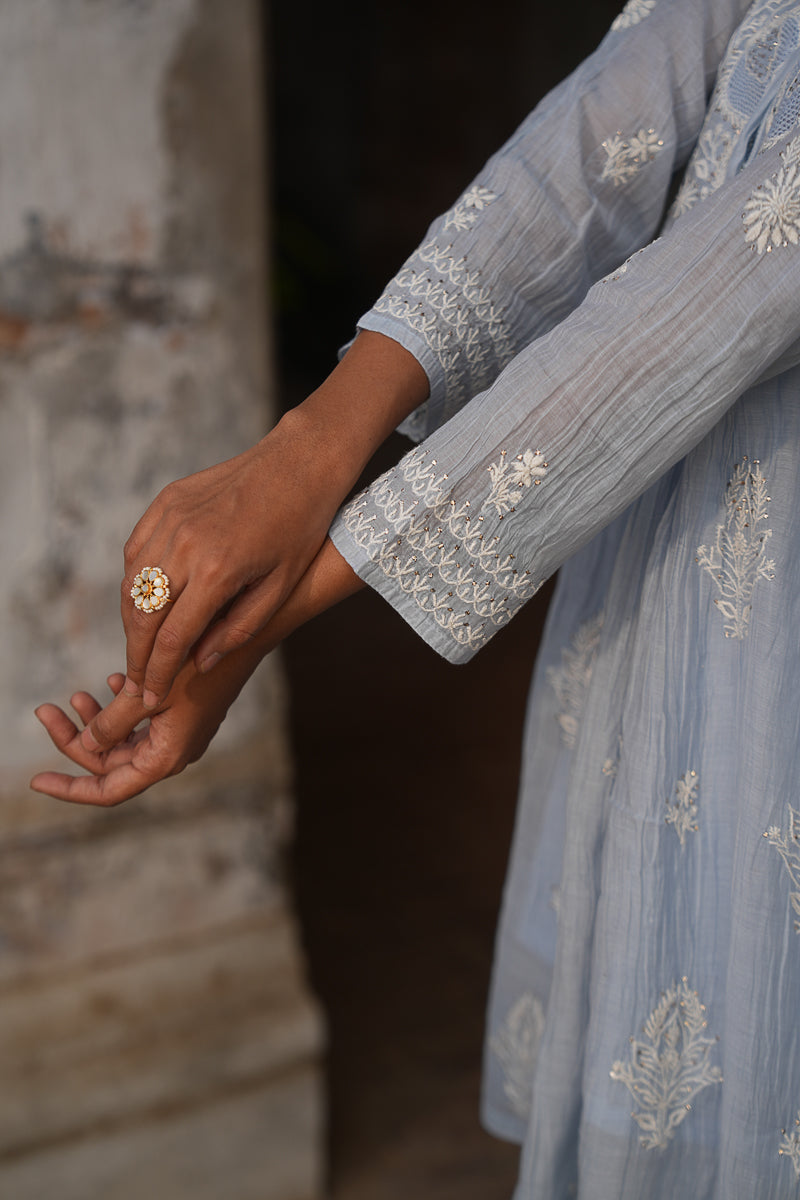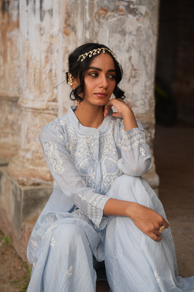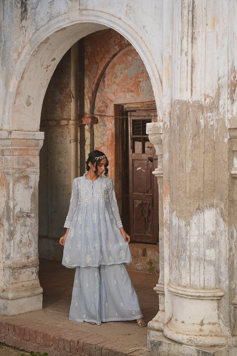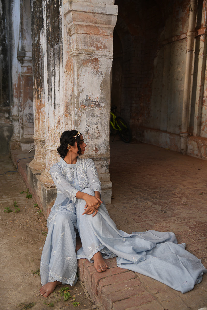 This Sky Blue Sharara Set in soft mul chanderi features hand-embroidered chikankari, enhanced with golden mukaish and jhaali work. The light, breathable fabric paired with intricate detailing makes it a perfect pick for summer festivities and intimate celebrations. Handcrafted with care, this three-piece set is all about effortless elegance.