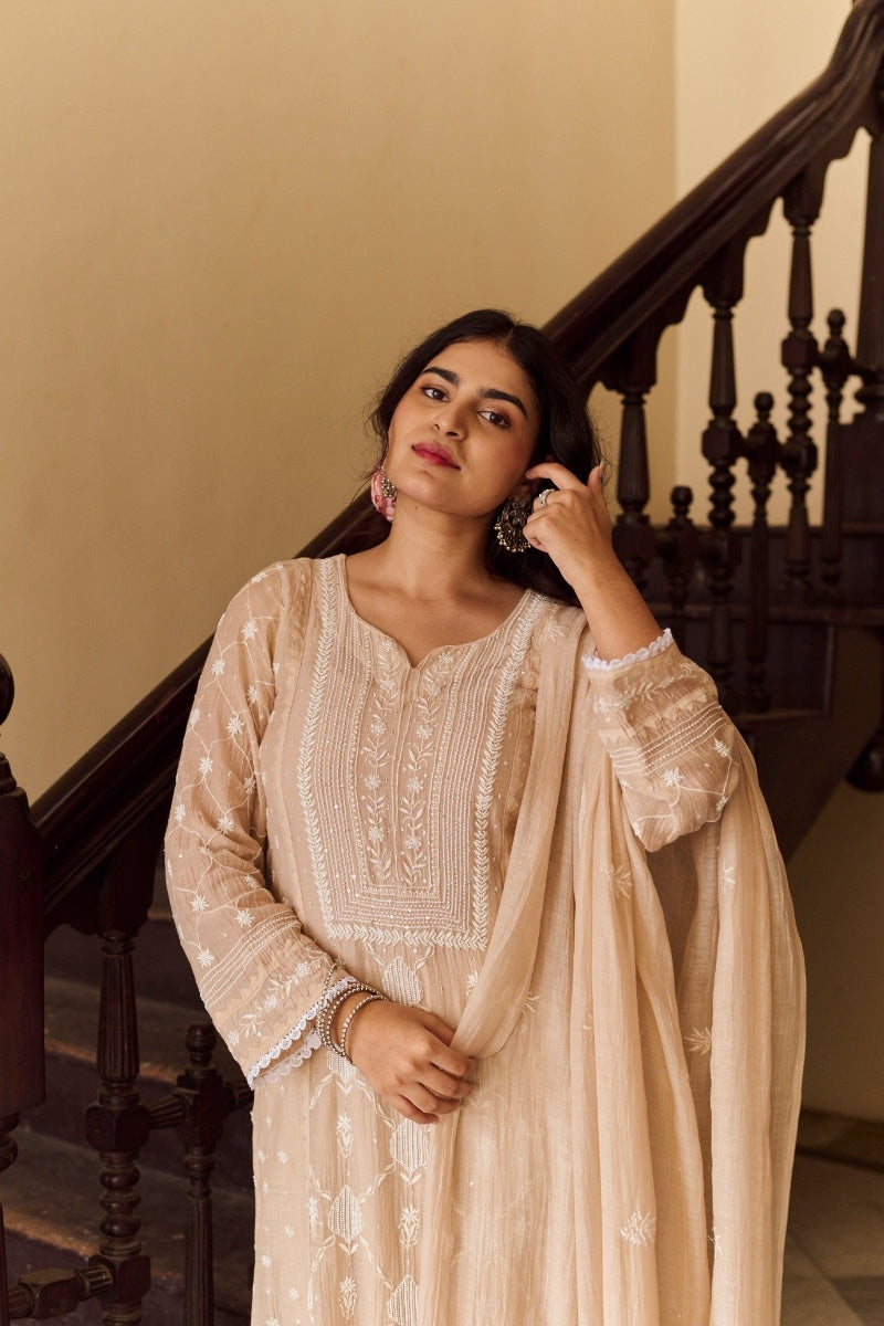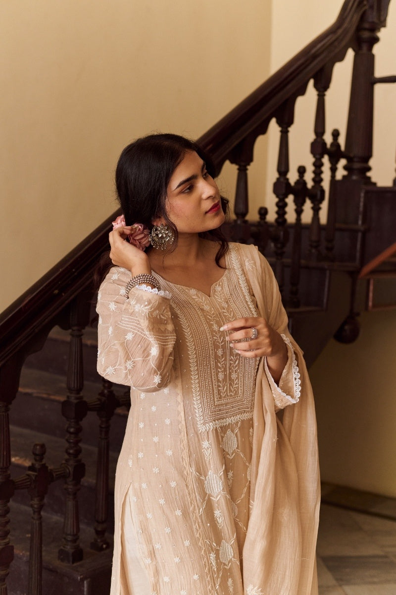 A serene beige kurta set in airy mul chanderi, offering a gentle sheen and lightweight drape for effortless elegance. Delicate chikankari is tastefully highlighted with cutdana for a refined sparkle suited to daytime celebrations and evening gatherings.