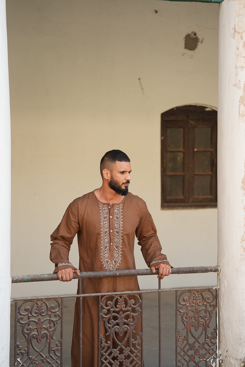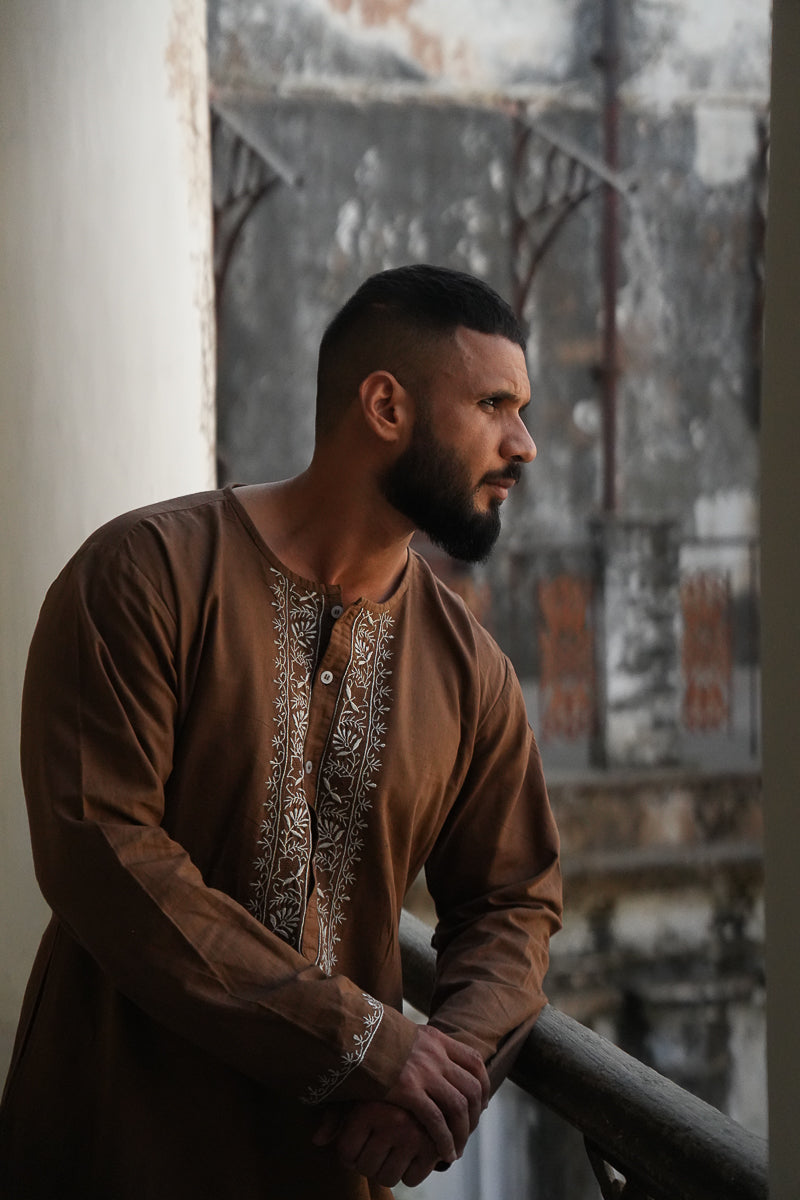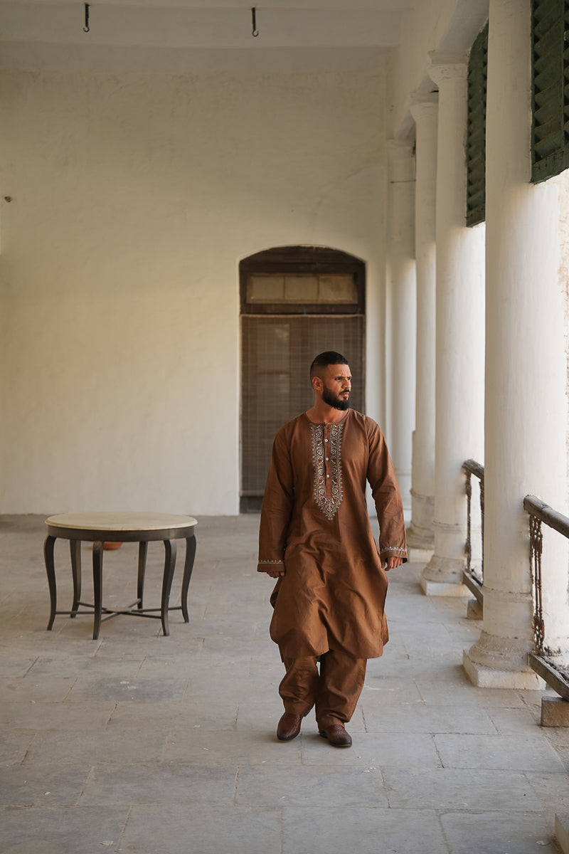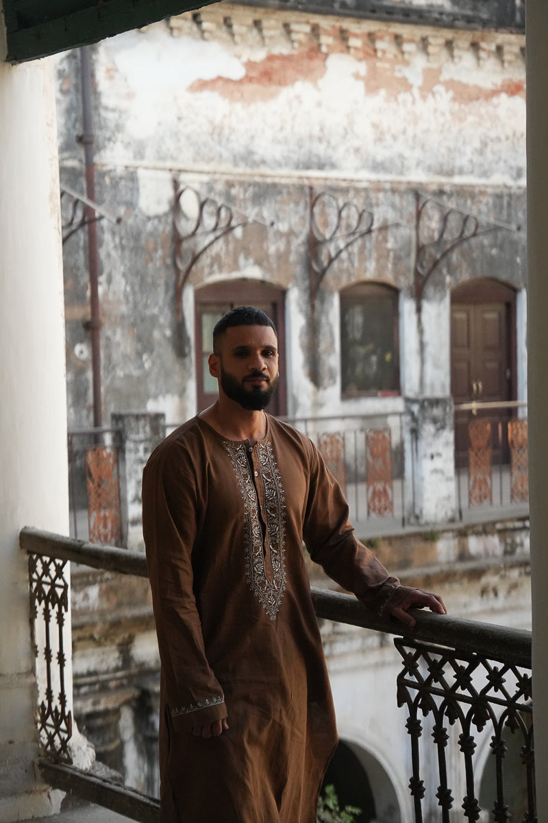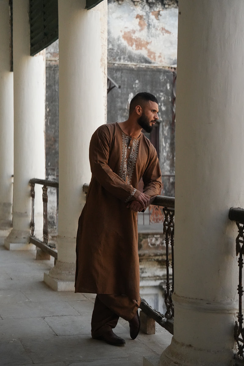 This brown linen kurta is adorned with fine Chikankari embroidery that adds a handcrafted touch to its breathable, textured fabric. The natural finish of linen meets delicate threadwork, creating a piece that’s equal parts relaxed and refined. Perfect for daytime festivities, intimate gatherings, or simply dressing up with ease.