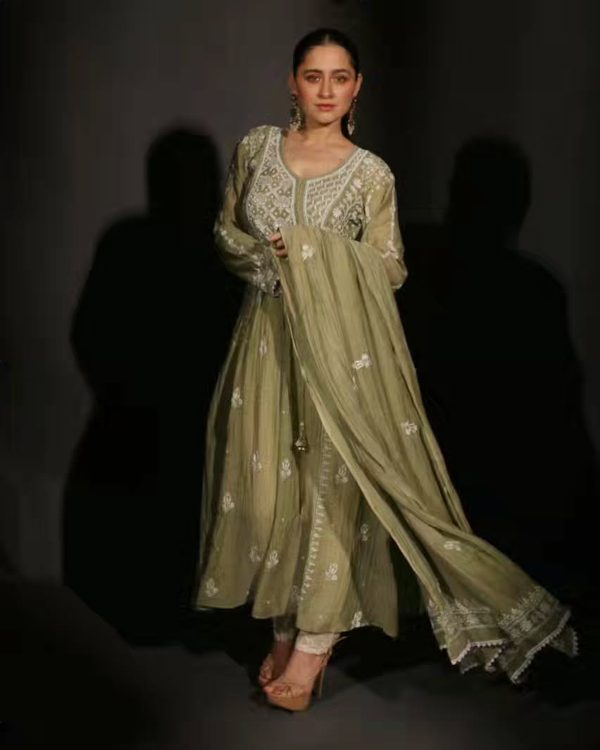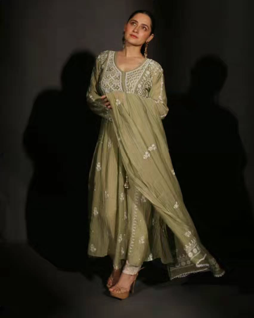 Radiate timeless charm in our Green Chikankari Women’s Angharkha Set, crafted in luxurious mul chanderi for an airy, graceful drape. The ensemble features delicate handcrafted chikankari embroidery, beautifully accented with shimmering cutdana motifs that add just the right touch of festive sparkle. Perfect for celebrations or intimate gatherings, this set blends heritage artistry with contemporary elegance, ensuring you stand out effortlessly.
