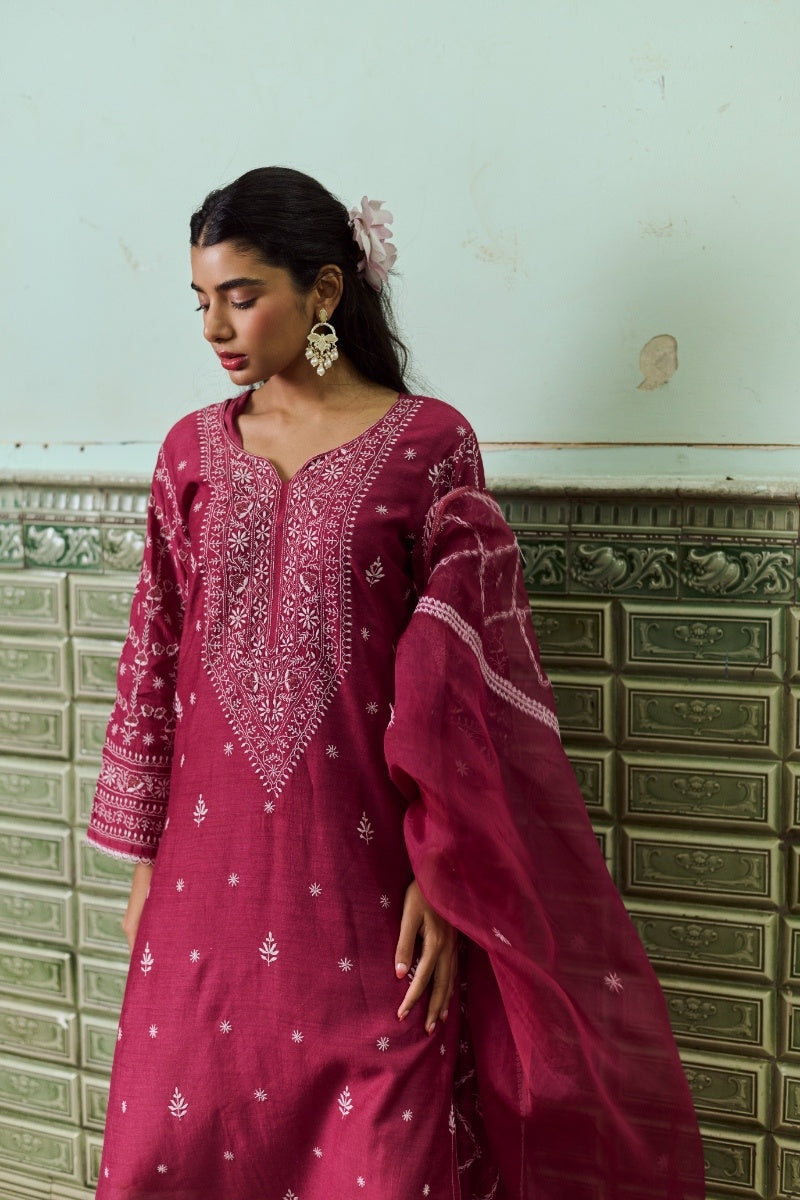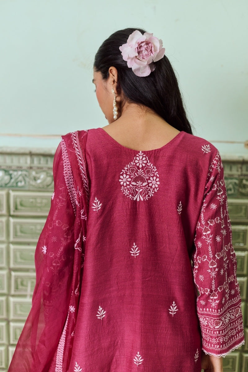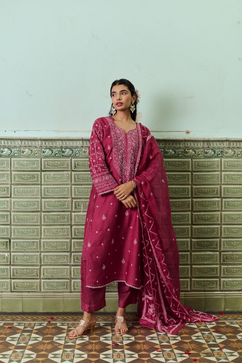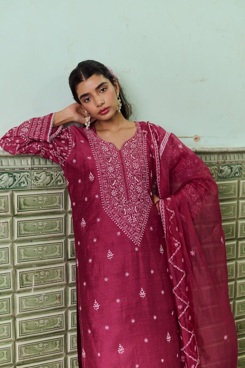 A rich moonga silk kurta set in a deep rose hue, showcasing artisanal chikankari elevated with kasab and jhaali work for luminous texture. Paired with a lightweight organza dupatta featuring coordinated motifs and a delicate scallop edge, it’s perfect for intimate weddings and festive evenings.