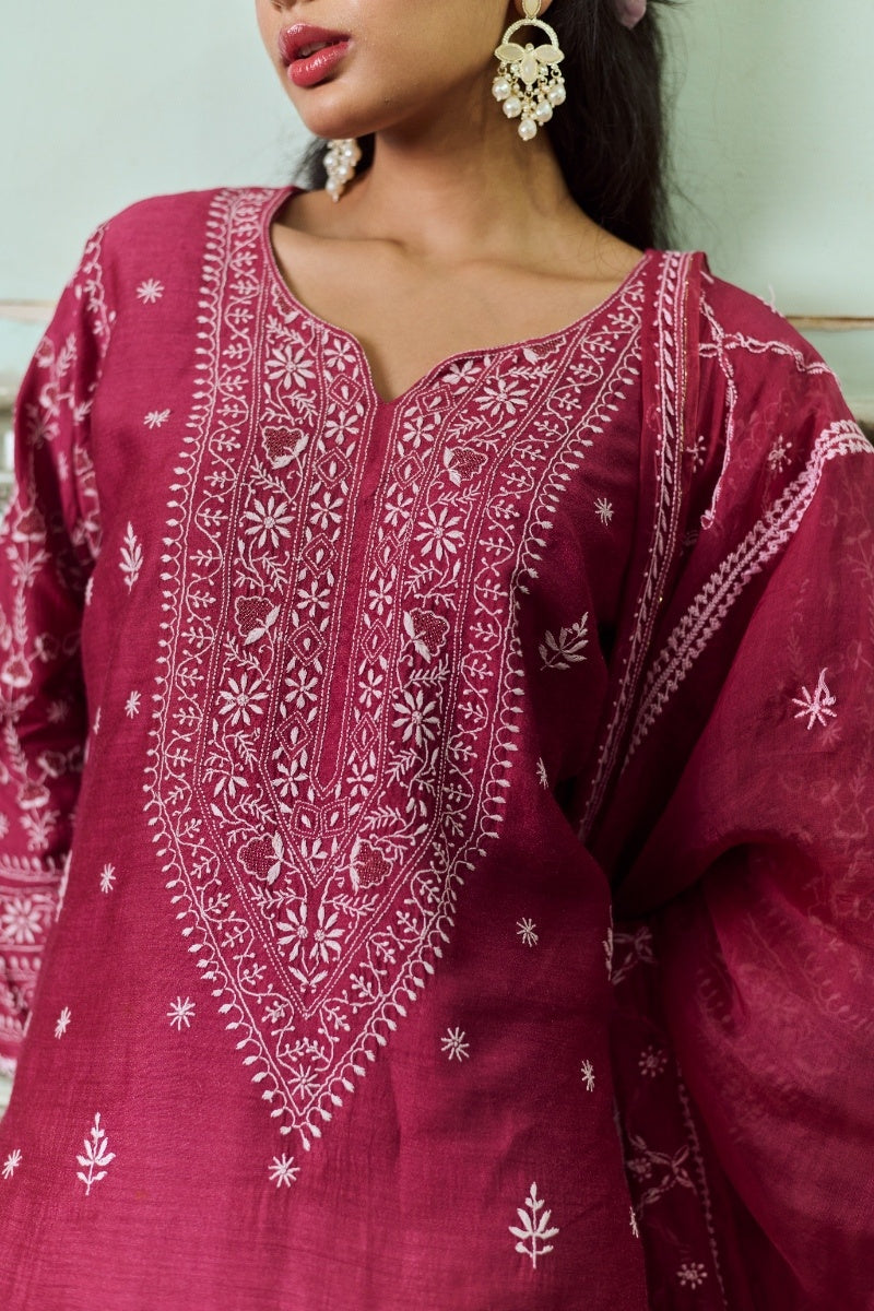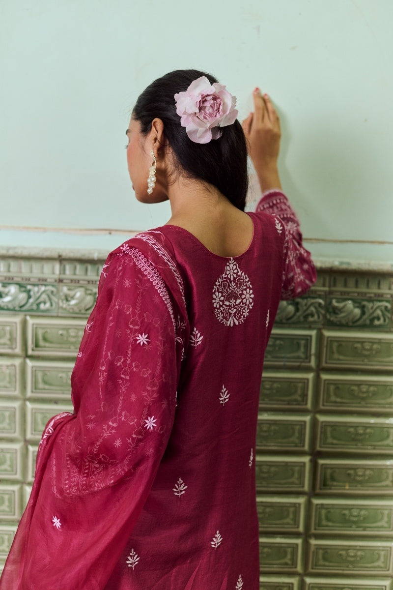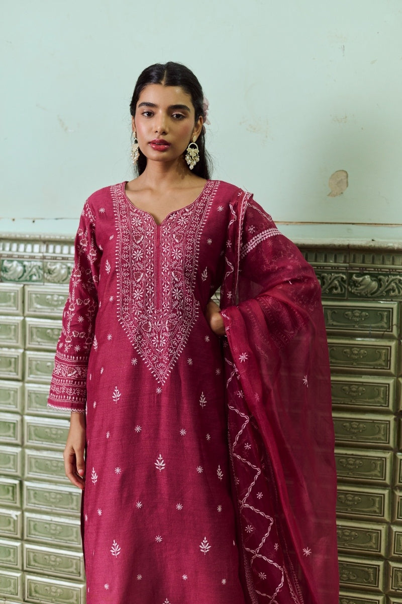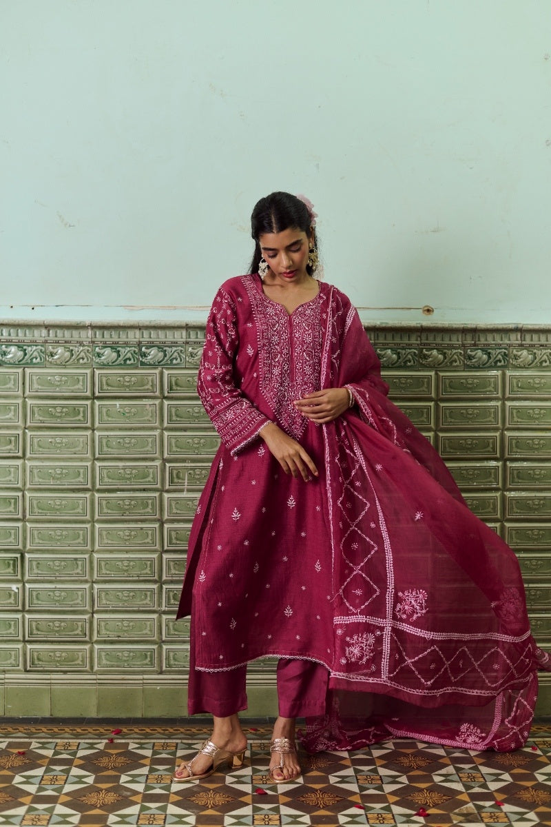 A rich moonga silk kurta set in a deep rose hue, showcasing artisanal chikankari elevated with kasab and jhaali work for luminous texture. Paired with a lightweight organza dupatta featuring coordinated motifs and a delicate scallop edge, it’s perfect for intimate weddings and festive evenings.