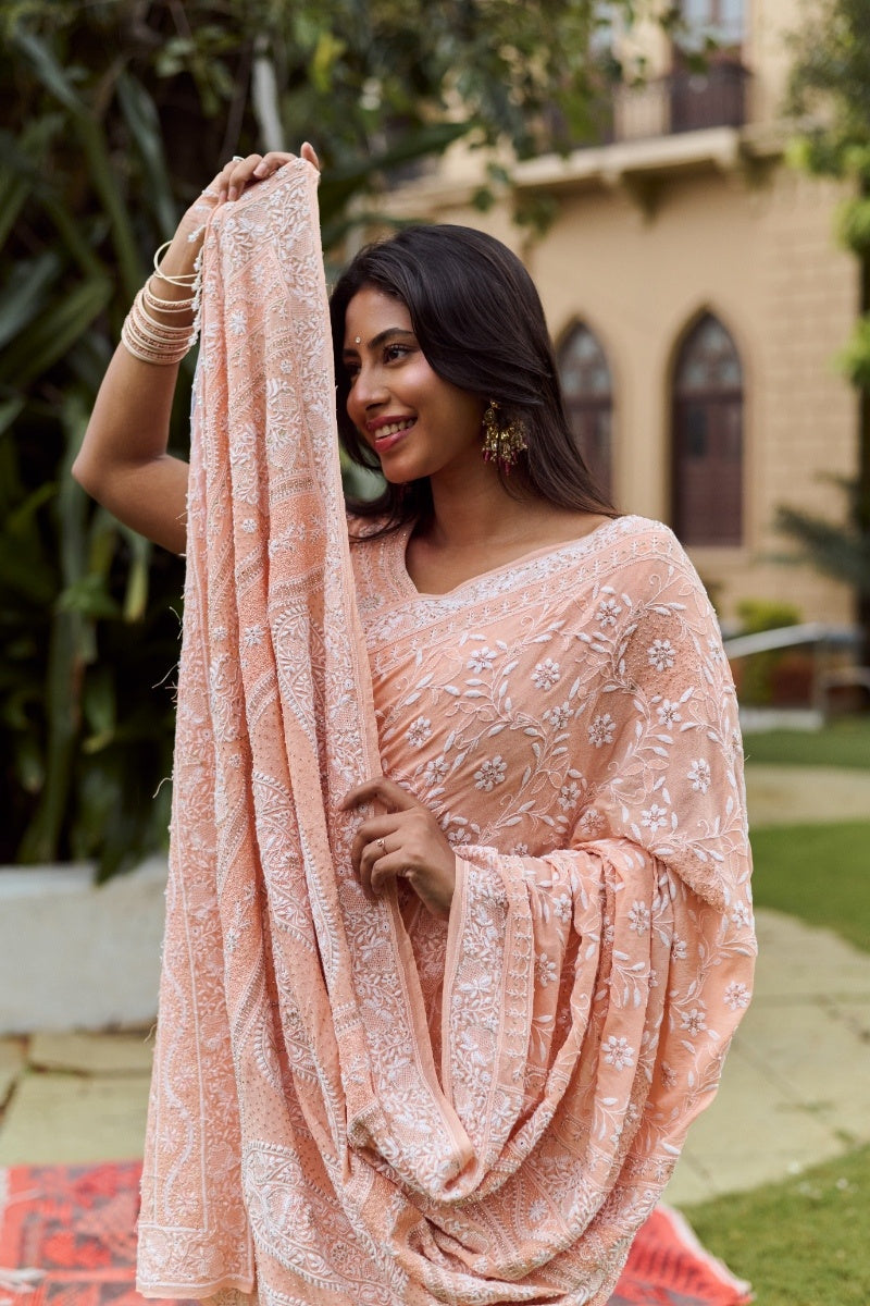 A breezy orange georgette saree adorned with delicate chikankari, elevated by subtle cutdana sparkle along the motifs and border for a luminous, festive finish. Lightweight drape and soft movement make it perfect for daytime celebrations, cocktails, and wedding functions.