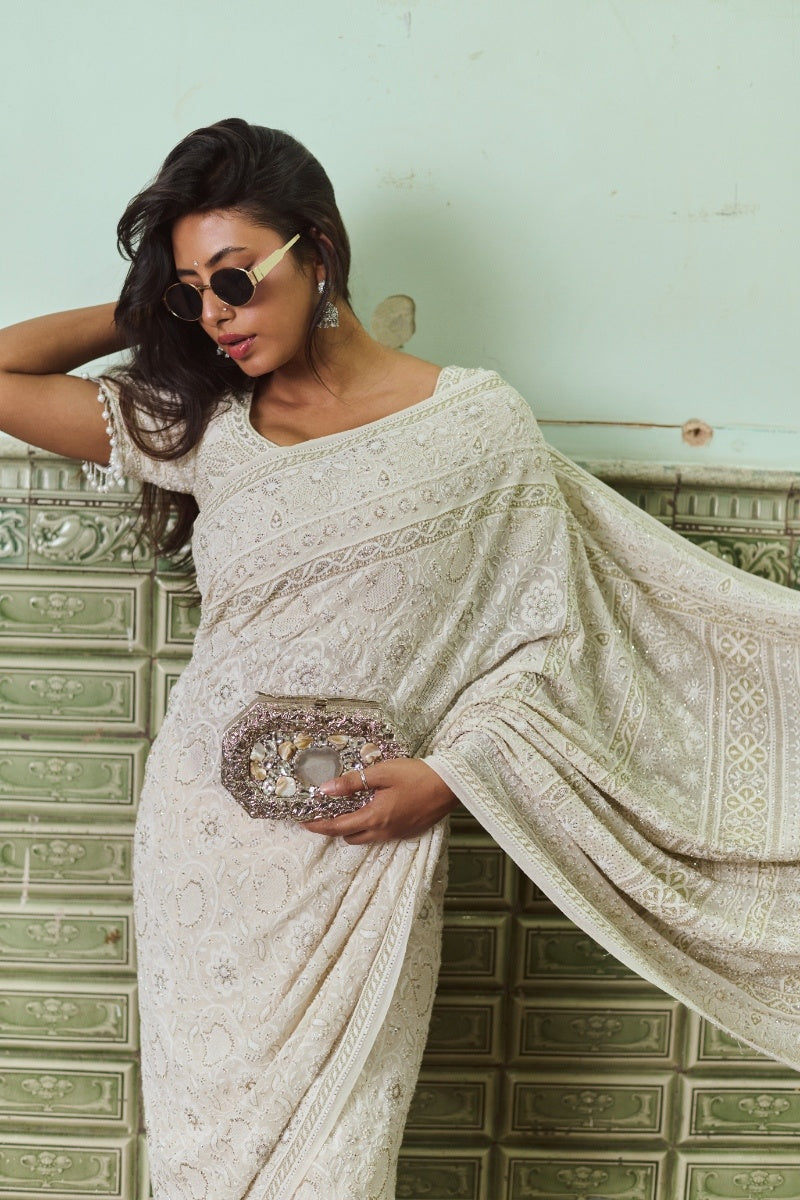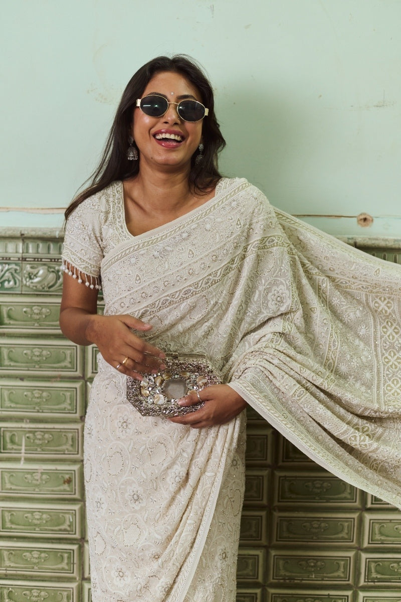 An elegant white georgette saree featuring airy jhaali texture and intricate chikankari-inspired motifs, elevated with shimmering cutdana and pearl accents. The fluid drape and tonal embellishment create a luminous, occasion-ready look for receptions, cocktails, and festive soirées.